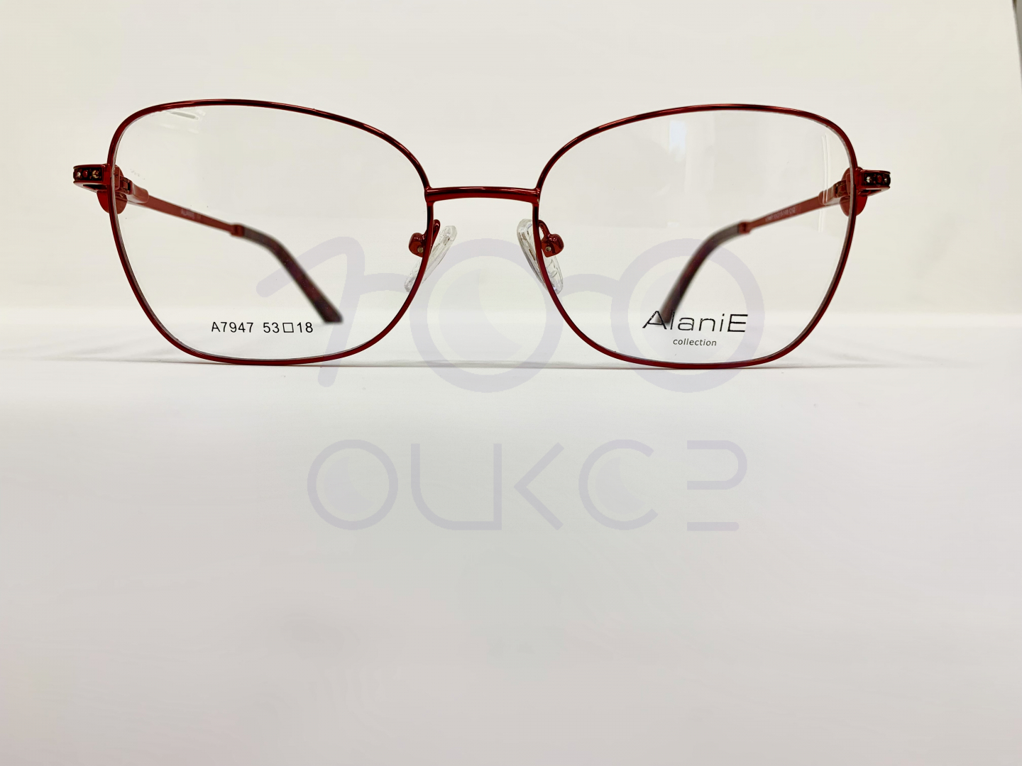 Цвет оправы- красный металлик, заушники перламутровые, на дужке украшение